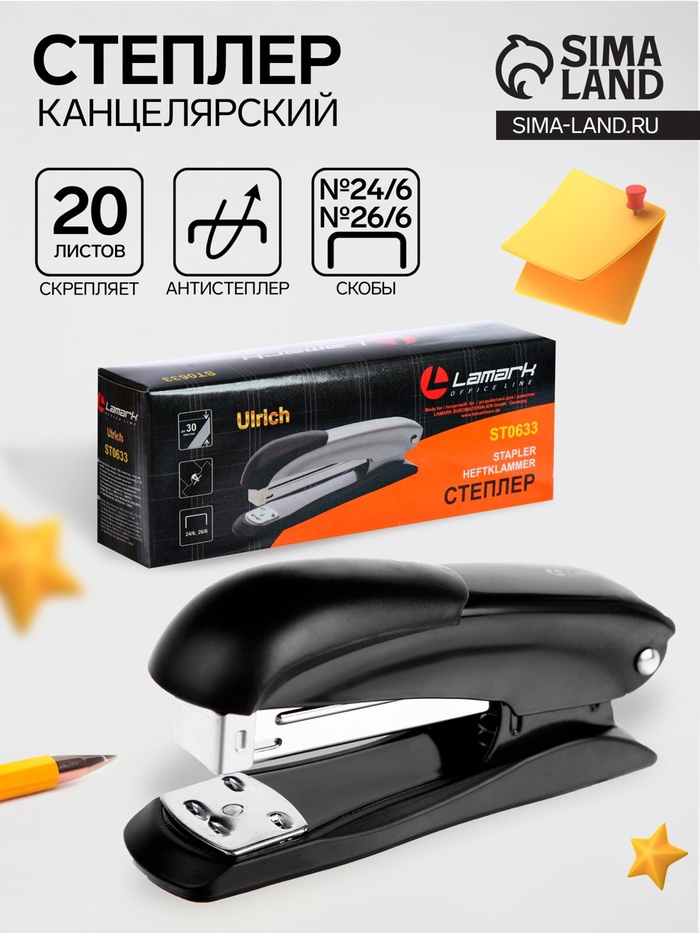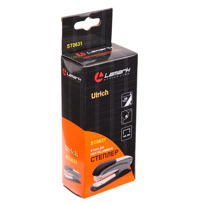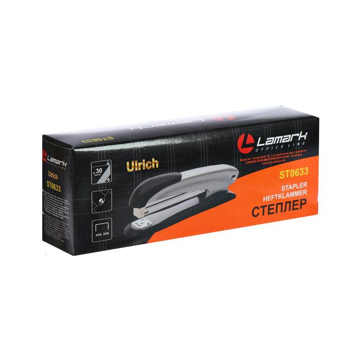 Степлер № 24/6, 26/6, Lamark Ulrich, встроенный антистеплер, индикатор скоб, до 20 листов, металлический корпус, чёрный — Характеристики