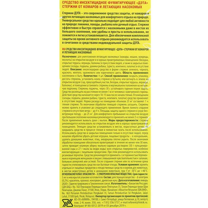 Фумигирующие стержни инсектицидные "ДЭТА" имеют не только высокую эффективность, но и удобство использования. Стержни рекомендуется использовать на открытом воздухе. Использовать средство в закрытом помещение только в отсутствии людей, после обработки помещение необходимо проветрить в течении не менее 30 минут.