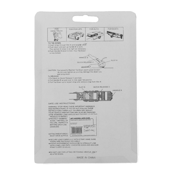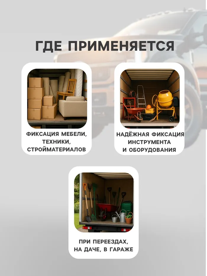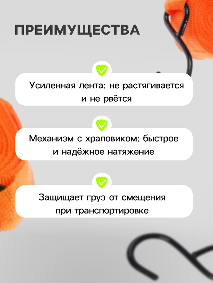 Незакрепленный груз при транспортировке может смещаться или переворачиваться, что так же несет в себе опасность для других участников дорожного движения. Для того чтобы обезопасить других водителей и сам груз, при его перевозке необходимо использовать специальные средства крепления. Одним из наиболее распространенных и надежных способов закрепить груз является применение стяжных ремней. Стяжки надежно фиксируют, что препятствует продольному и поперечному смещению грузов при ускорениях транспортного средства, при маневрировании и при преодолении уклонов, а так же сохраняют его внешний вид и целостность. По сравнению с иными средствами крепления грузов (веревками, цепями и т.д.), они отличаются простотой и легкостью применения. Отличное приспособление для надежной фиксации груза, стяжка поможет обеспечить его полную сохранность и безопасность. Изделие изготовлено из высокопрочной полипропиленовой нити, поэтому оно обладает устойчивостью к воздействиям окружающей среды и техническим жидкостям. Прочные волокна устойчивы к процессу трения и высоким нагрузкам, разрывам, а также воздействию влаги и холода.