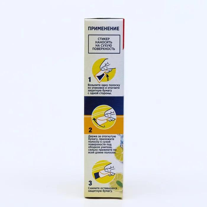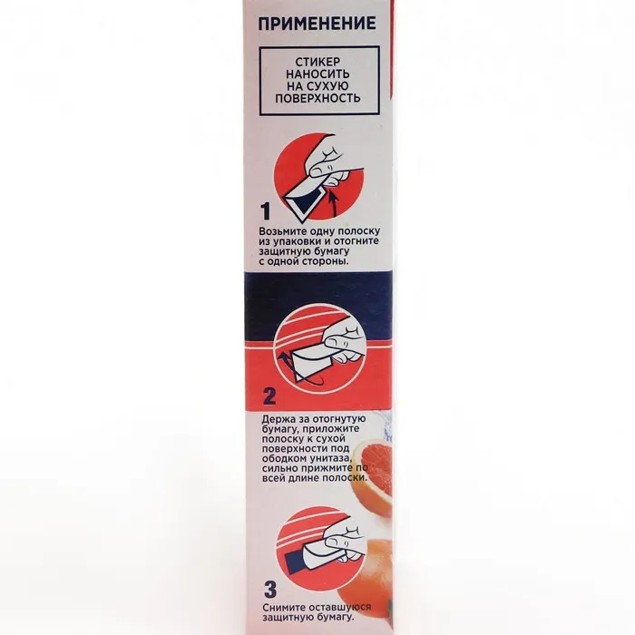 Способ применения: стикер наносить на сухую поверхность. Возьмите одну полоску из упаковки и отогните защитную бумагу с одной стороны. Держа за отогнутую бумагу, приложите полоску к сухой поверхности под ободком унитаза, сильно прижмите по всей длине полоски. Снимите оставшуюся защитную бумагу.