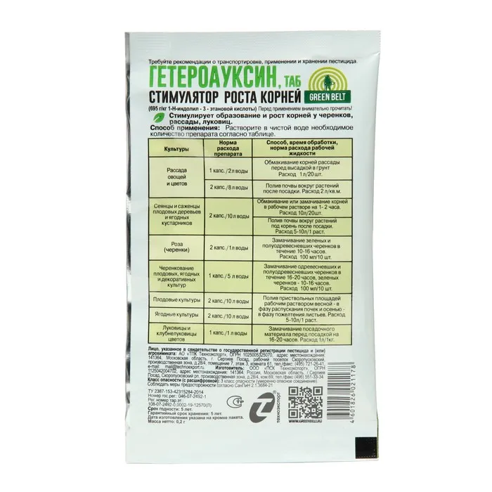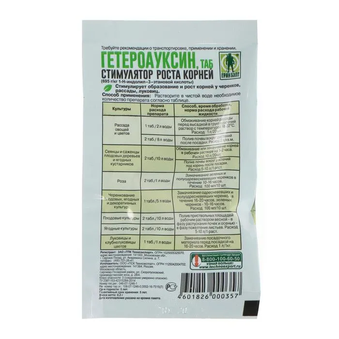 Стимулятор корнеобразования "Гетероауксин" Грин Бэлт, 2 таб по 0,1 г — Характеристики