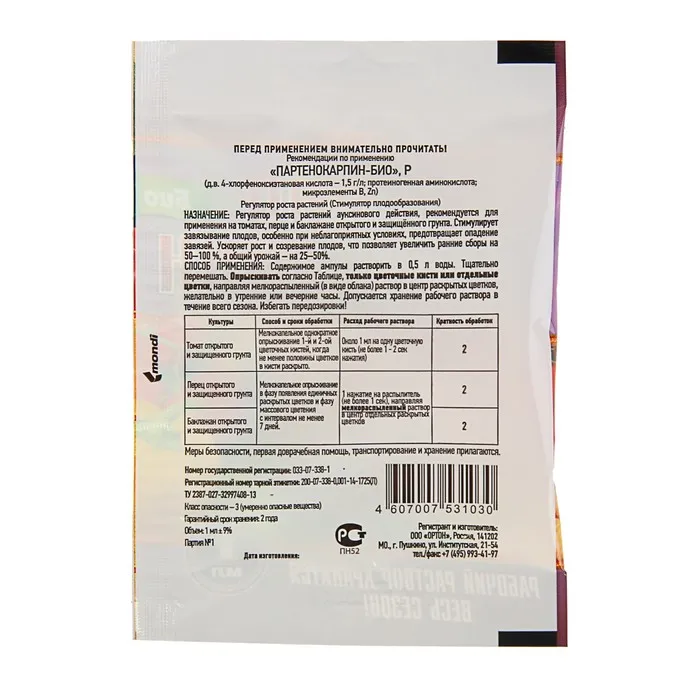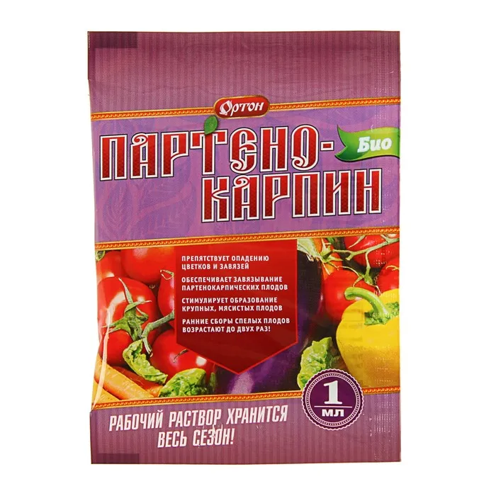 Препарат "Партенокарпин-БИО" выпускается в уникальной ампуле, которая может использоваться многократно и позволяет дозировано (8 капель на 1 стакан воды) применять препарат, а также хранить его остатки в течение месяца Опрыскивание: на томатах: 1-е - в фазе цветения первой кисти, 2-е - в фазе цветения второй кисти на перце и баклажанах: 1-е - в фазе начала цветения, 2-е - в фазе массового цветения(не менее, чем через 7 дней после первого опрыскивания).
