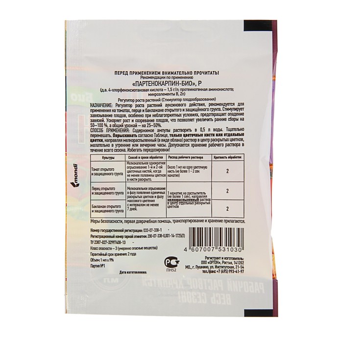 Стимулятор плодообразования "Ортон", "Партенокарпин-БИО", 1 мл — Характеристики