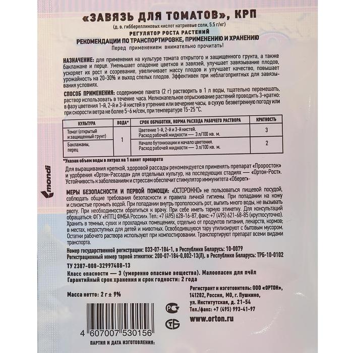 Стимулятор плодообразования "Завязь" для Томатов, 2 г — Характеристики