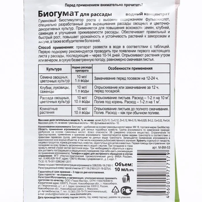 Биогумат для рассады — удобрение в удобной упаковке с помпой-распылителем. Предназначено для подкормки саженцев, рассады цветочных, овощных и ягодных культур. Экологически безопасно, содержит необходимые для активного роста и развития растений гуминовую кислоту, фосфор, азот, калий. Средство полностью готово к применению, не требует разведения. Обработку проводят в пасмурную погоду, оберегая растения от попадания прямых солнечных лучей. Перед применением необходимо взболтать.