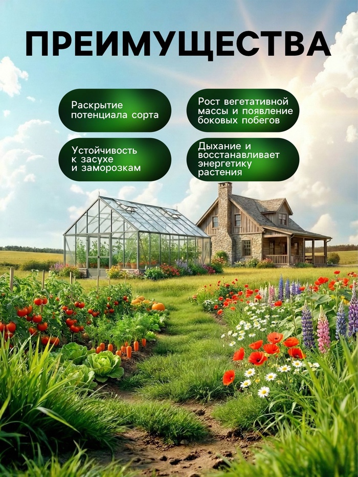 - Поддержка при стрессах: средство помогает быстрее восстанавливаться после пересадки, засухи или резких перепадов температуры.