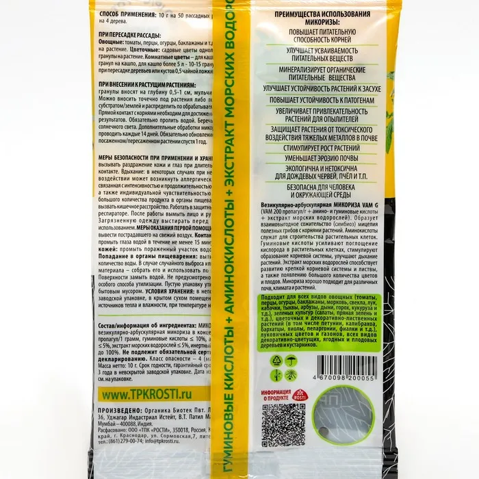 Микориза - препарат, в состав которого входит мицелий микоризных грибов и микроэлементы на базе торфа. Эндомикоризные грибы рода Glomus способны заселять корни культурных растений, и формируя с ними взаимовыгодное существование (симбиоз). Мощный ферментный аппарат мицелия переводит питательные вещества, поступающие растению, в легкоусвояемую форму, и поставляет их корням в оптимальной дозировке. Контактирующие с корнями растения нити микоризы намного больше самих корней, в результате растение получает больше питательных веществ, а взамен отдаёт микоризному мицелию углеводы. В результате растение после подкормки микоризой активнее развивается и лучше себя чувствует. Мицелий конкурирует за среду обитания с селящимися на корнях растения патогенными микроорганизмами, в результате чего их развитие подавляется, что положительно сказывается на здоровье растений. Наиболее актуально использование микоризы Зелёное сечение на почвах, бедных микроэлементами.