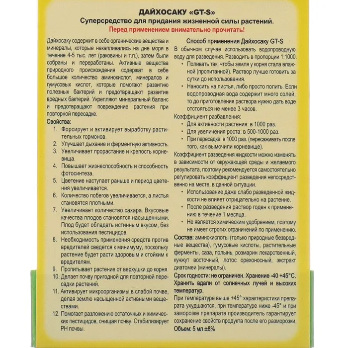 Дайхосаку содержит в себе органические вещества и минералы, которые накапливались на дне моря в течение 4-5 тыс. лет (раковины и т.п.), затем были собраны и переработаны. Активные вещества природного происхождения содержат в себе большое количество аминокислот, минералов и гумусовых кислот, которые помогают развитию полезных бактерий и предотвращают развитие вредных бактерий. Укрепляют минеральный баланс и предотвращают повреждение растения при повторной пересадке.