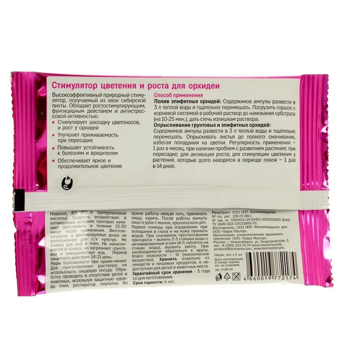 Опрыскивание эпифитных и грунтовых орхидей - содержимое ампулы (1мл) развести в 3-х литрах теплой воды и тщательно перемешать. Опрыскивать листья до полного смачивания, избегая попадания на цветки.