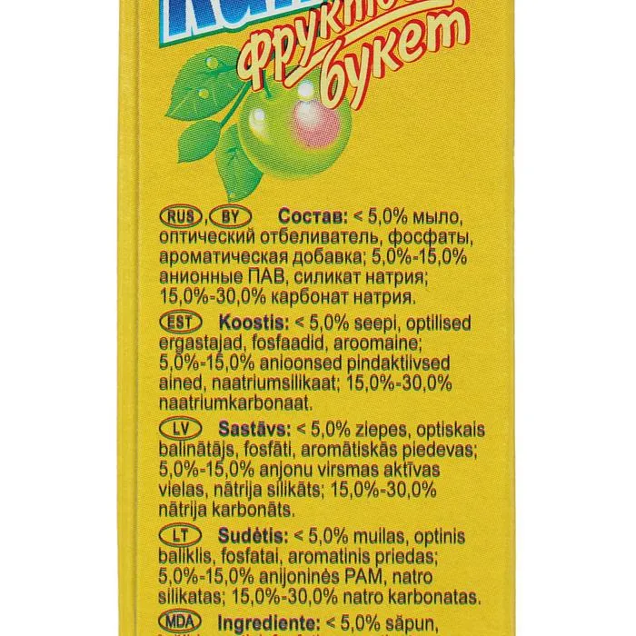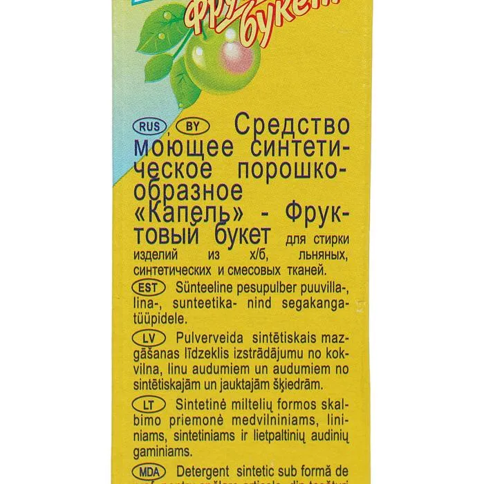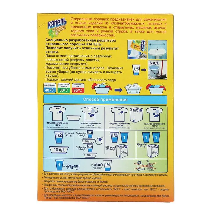 Используйте порошок «Капель: Фруктовый букет» для замачивания и стирки изделий из хлопчатобумажных, льняных и смешанных волокон.