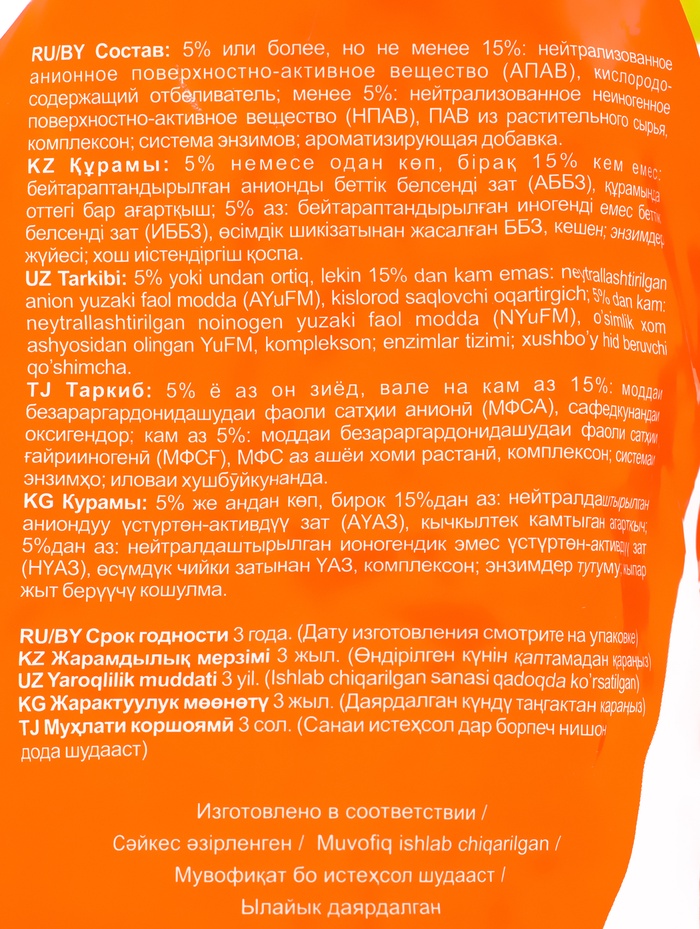 Упаковка 3 кг рассчитана на 20 стирок, удобна в хранении и позволяет точно дозировать средство для каждой стирки.