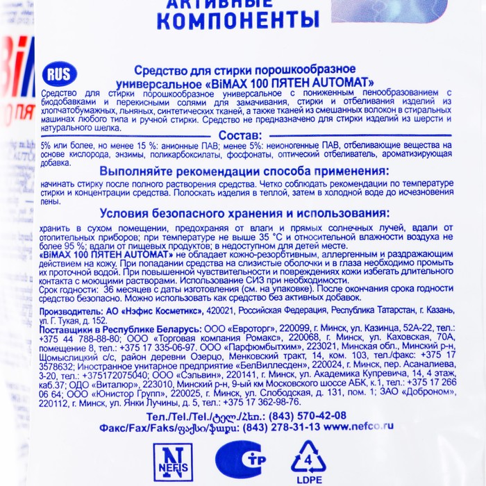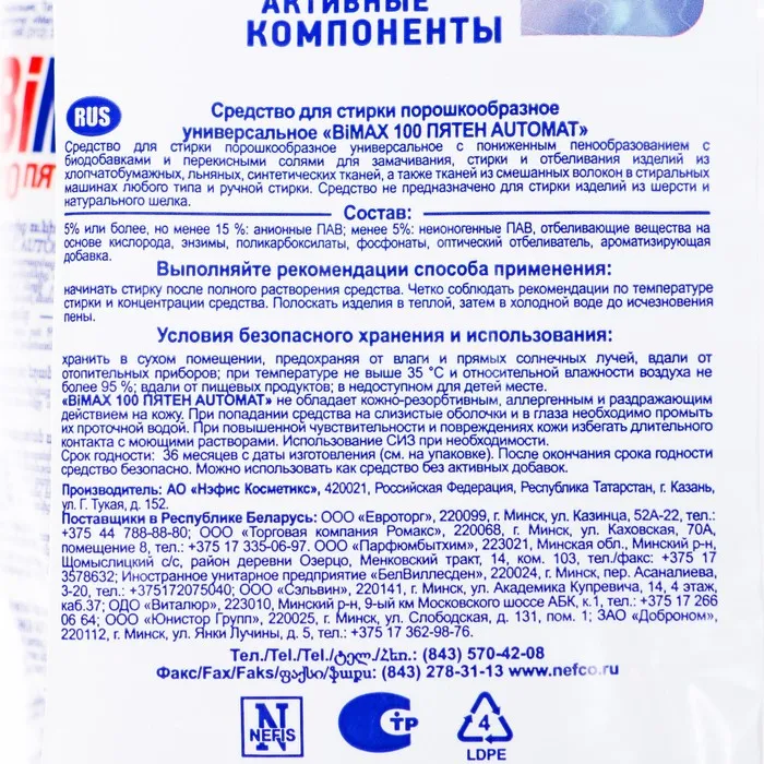 Стиральный порошок BiMax "100 пятен", автомат, 6 кг — Характеристики