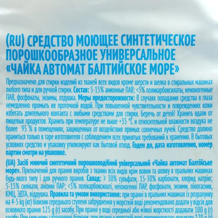 Меры предосторожности: хранить отдельно от пищевых продуктов, в местах недоступных детям. При повышенной чувствительности и повреждениях кожи избегать длительного контакта с любым средством для стирок. В случае попадания средства в глаза промыть большим количеством воды.