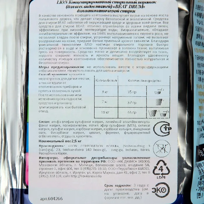 Состав: пав 2,7%, анионные 5%, кислородный отбеливатель, цеолит, фермент, флуоресцентный отбеливатель, ароматизатор.