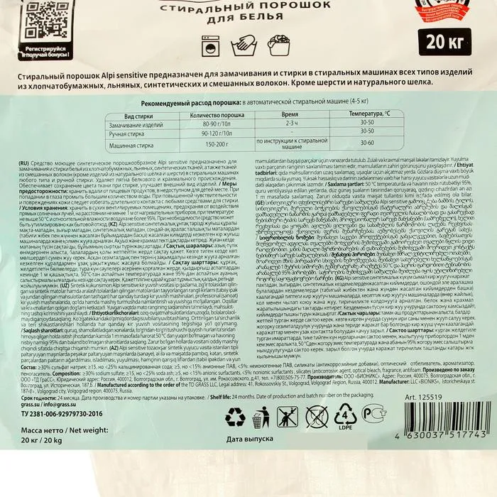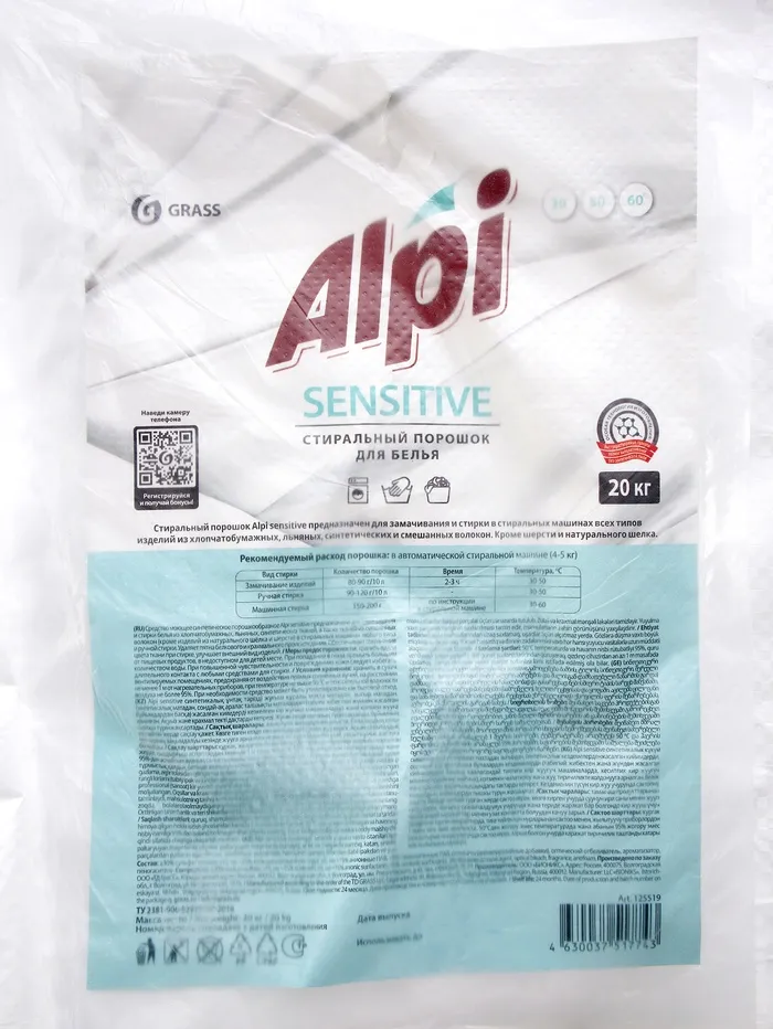 Стиральный порошок Grass Alpi Sensitive, универсальный, 20 кг — Характеристики