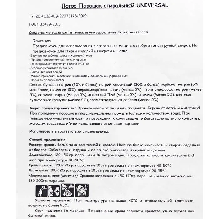 - Универсальное применение: Стиральный порошок "Лотос Универсальный" предназначен для стирки различных типов тканей, обеспечивая эффективное удаление загрязнений.