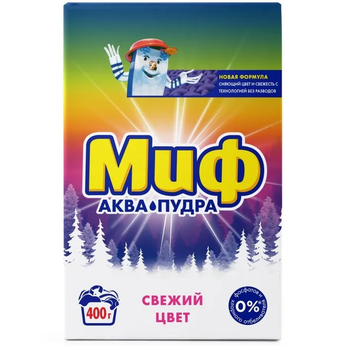 Порошок «Миф» 3 в 1 «Свежий цвет» используется для ярких вещей. Он подходит для стиральных машин любого типа. Формула с пониженным уровнем пенообразования облегчает процесс полоскания белья и помогает сохранить яркость красок.