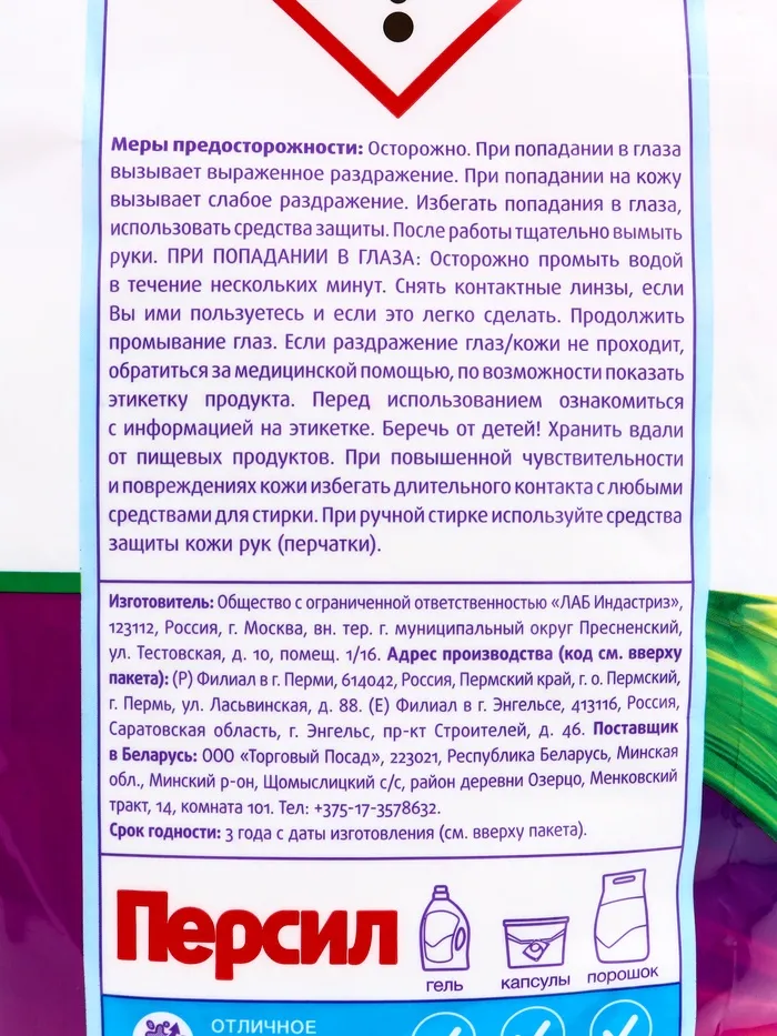 Осторожно. При попадании в глаза вызывает выраженное раздражение глаз. Избегать попадания в глаза, использовать средства защиты. После работы тщательно вымыть руки. При попадании в глаза: осторожно промыть водой в течение нескольких минут. Снять контактные линзы, если Вы ими пользуетесь и если это легко сделать. Продолжить промывание глаз. Если раздражение глаз не проходит, обратиться за медицинской помощью, по возможности показать этикетку продукта. Перед использованием ознакомиться с информацией на этикетке. Беречь от детей! Хранить вдали от пищевых продуктов. При повышенной чувствительности и повреждениях кожи избегать длительного контакта с любыми средствами для стирки. При ручной стирке используйте средства защиты рук (перчатки).