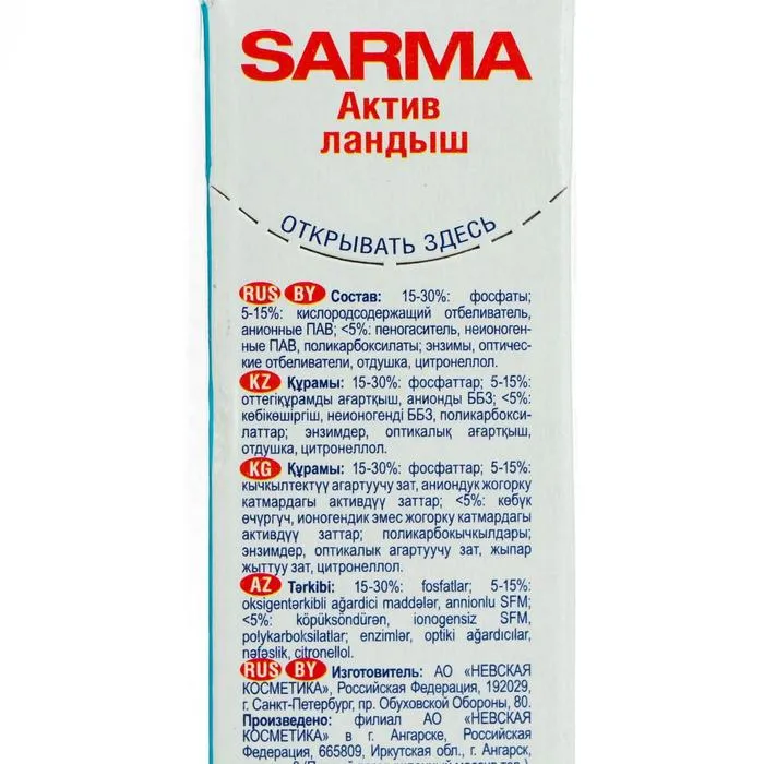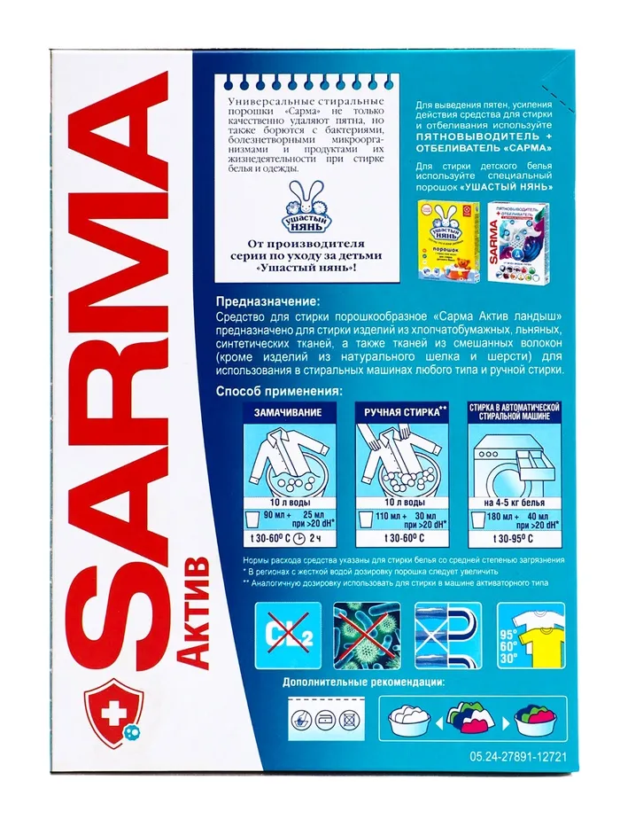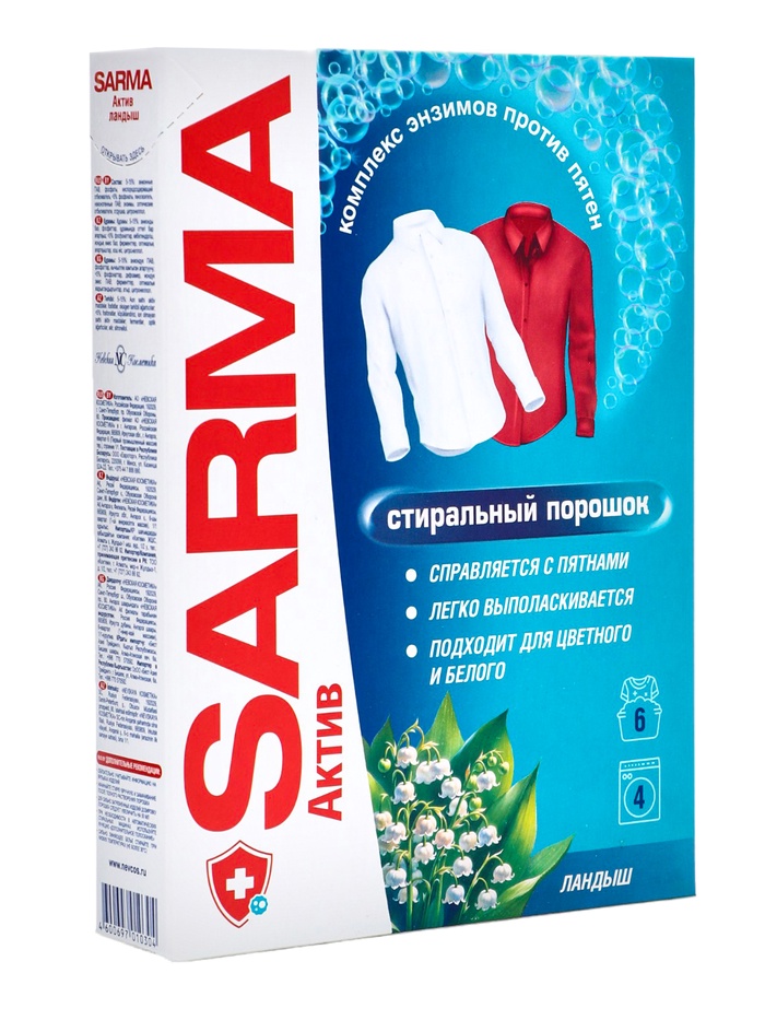 Используйте стиральный порошок Sarma «Актив: Ландыш» для белого и светлого белья из хлопчатобумажных и синтетических тканей, а также вещей из смешанных волокон.