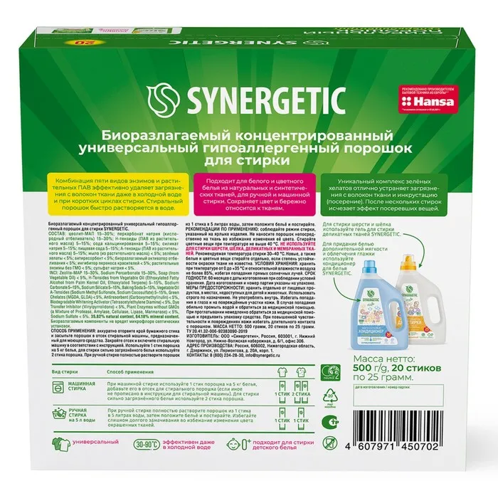 Стиральный порошок SYNERGETIC - экологичный, безопасный, универсальный, гипоаллергенный и эффективный суперконцентрат в стиках.