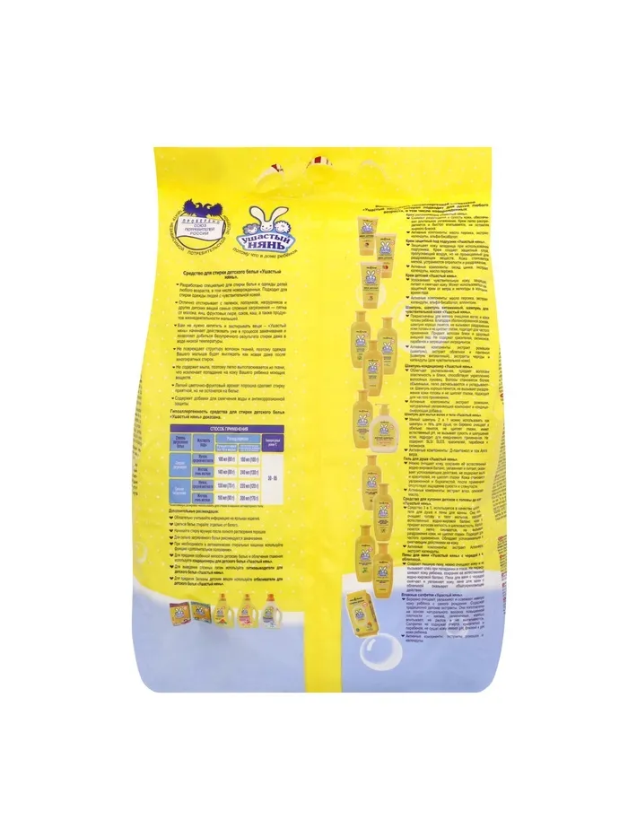 Стиральный порошок «Ушастый нянь» специально разработан для чистки белья и одежды детей любого возраста, в том числе и новорождённых.