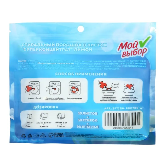 Упаковка содержит 30 листов, что обеспечит длительное использование. Стиральный порошок в листах "Мой выбор" - это надежный помощник в уходе за вашими вещами. Он обеспечивает чистоту и свежесть, а также сохраняет первоначальный вид и качество тканей.