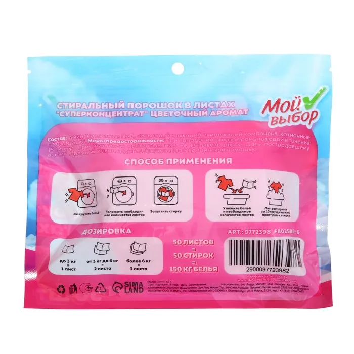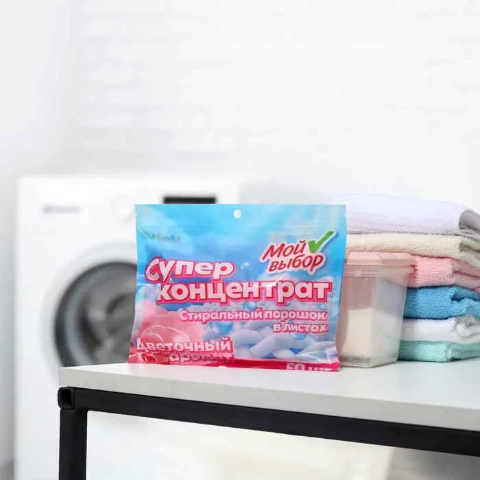 Упаковка содержит 50 листов, что обеспечит длительное использование. Стиральный порошок в листах "Мой выбор" - это надежный помощник в уходе за вашими вещами. Он обеспечивает чистоту и свежесть, а также сохраняет первоначальный вид и качество тканей.