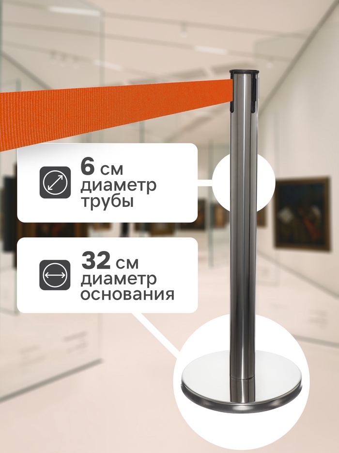 Стойка ограждение с оранжевой вытяжной лентой-280 см, высота-90 см, диаметр 6 см, напольный d=32 см — Характеристики