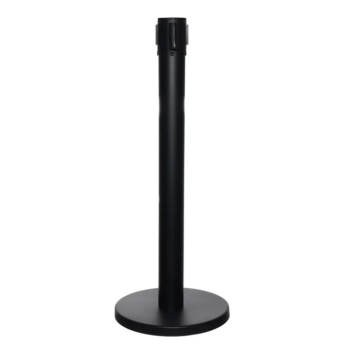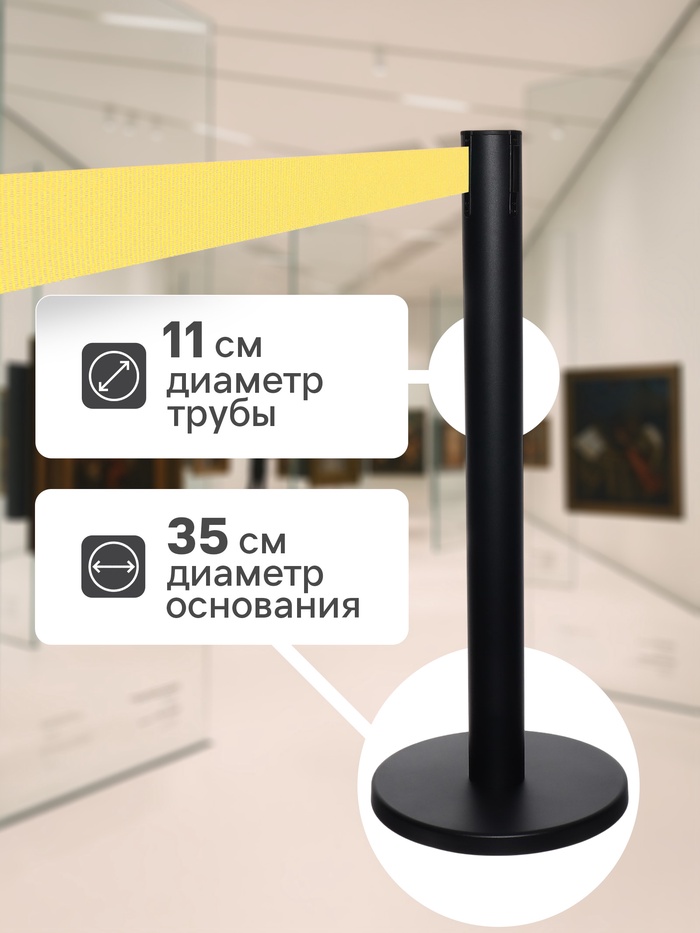 Стойка ограждения черная, с вытяжной лентой-470см желтая, высота-90см, d-11см, напольный d-35см — Характеристики