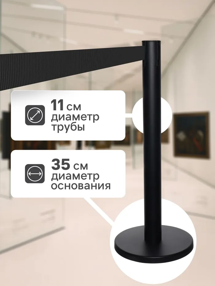 Стойка ограждения чёрная, с чёрной вытяжной лентой 470 см, высота 90 см, d=11 см, напольный d=35 см — Характеристики