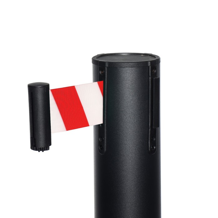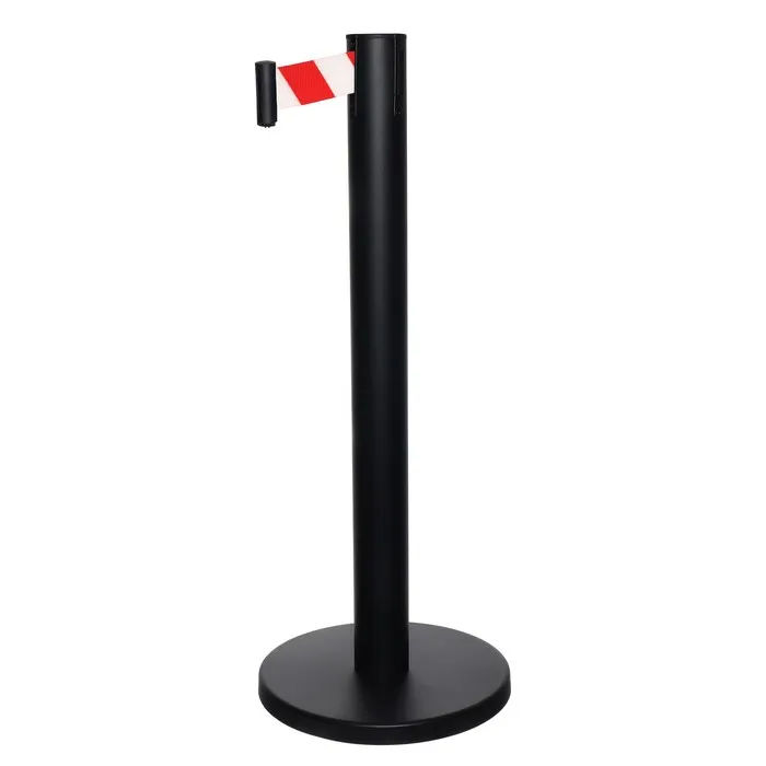 Стойка ограждения чёрная, с красно-белой вытяжной лентой 280 см, высота 90 см, d=6 см, напольный d=32 см