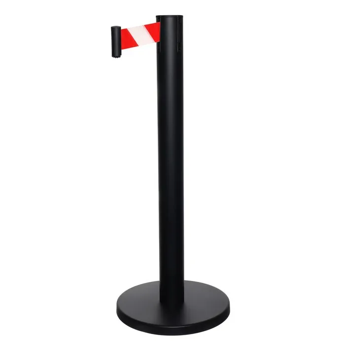 Стойка ограждения чёрная, с красно-белой вытяжной лентой 470 см, высота 90 см, d=6 см, напольный d=32 см