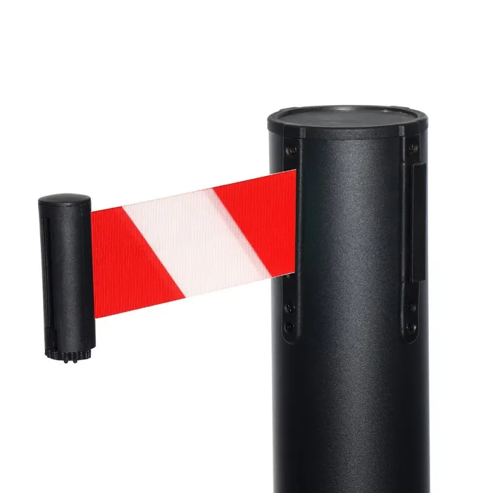 Стойка ограждения чёрная, с красно-белой вытяжной лентой 470 см, высота 90 см, d=6 см, напольный d=32 см — Характеристики