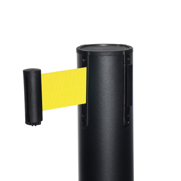 Стойка ограждения чёрная, с жёлтой вытяжной лентой 180 см, высота 90 см, d=6 см, напольный d=32 см