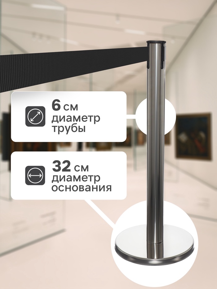 Стойка ограждения серебристая, с чёрной вытяжной лентой 280 см, высота 90 см, d=6 см, напольный d=32 см — Характеристики