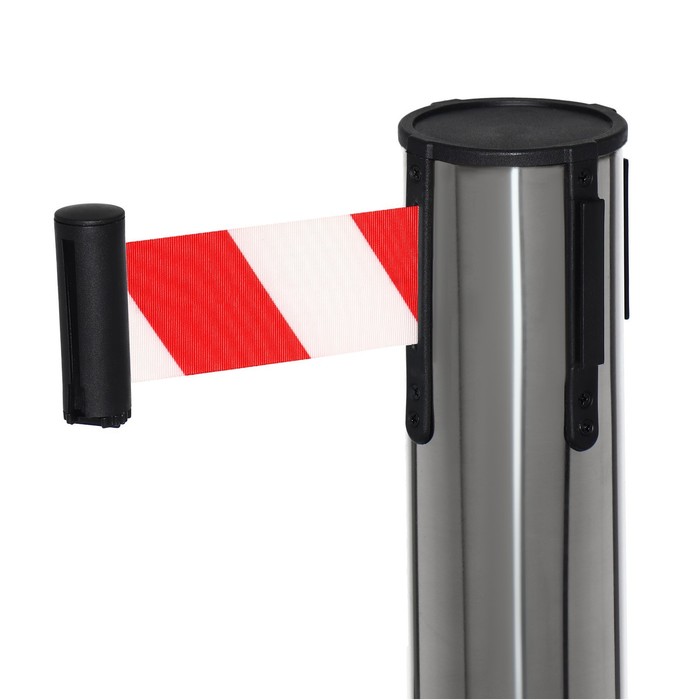 Стойка ограждения серебристая, с красно-белой вытяжной лентой 280 см, высота 90 см, d=6 см, напольный d=32 см