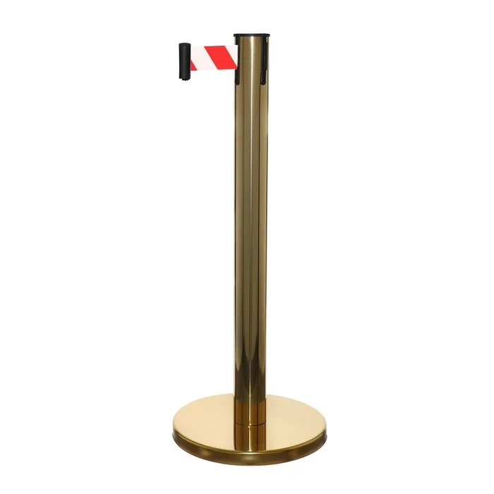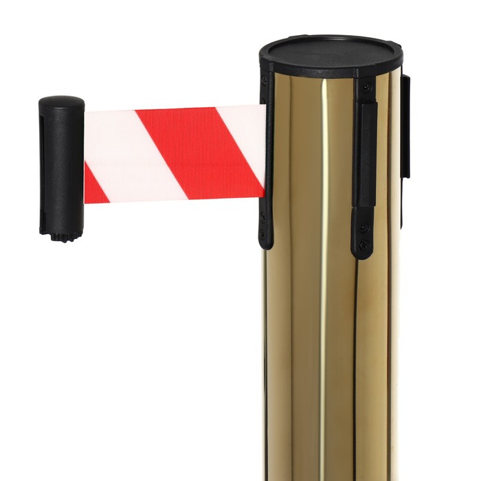 Стойка ограждения золотая, с красно-белой вытяжной лентой 180 см, высота 90 см, d=6 см, напольный d=32 см