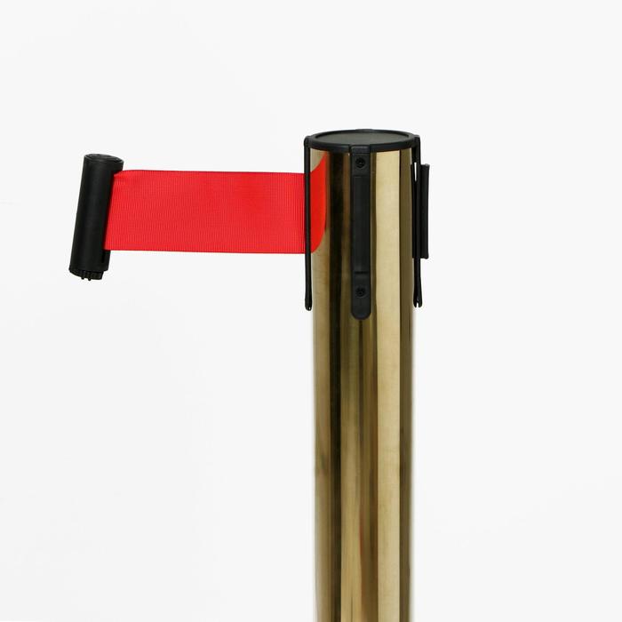 Стойка ограждения золотая, с красной вытяжной лентой 180 см, высота 90 см, d=6 см, напольный d=32 см станет важной деталью при построении одной этих из составляющих и предоставит широкий выбор решений при оборудовании интегрированных систем.