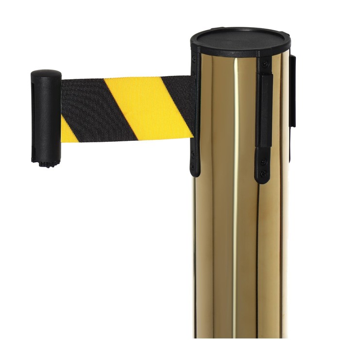 Стойка ограждения золотая, с жёлто-чёрной вытяжной лентой 180 см, высота 90 см, d=6 см, напольный d=32 см