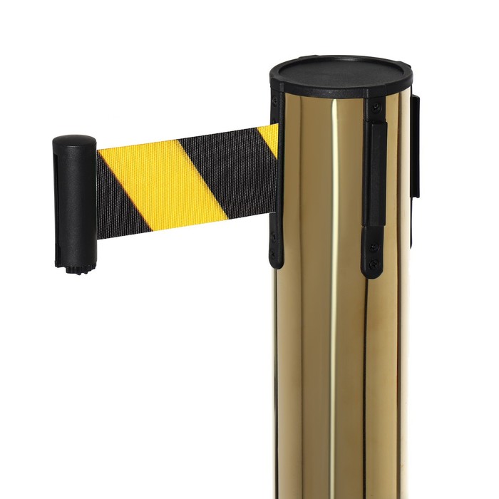 Стойка ограждения золотая, с жёлто-чёрной вытяжной лентой 470 см, высота 90 см, d=6 см, напольный d=32 см