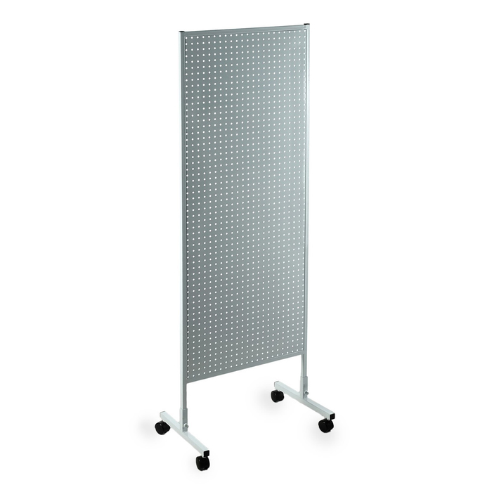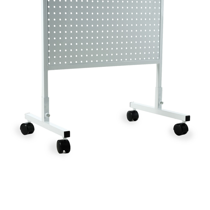 Каркас из трубы обеспечивает стойкости и долговечность конструкции, а белый цвет придает изделию стильный и современный внешний вид, который органично вписывается в любой интерьер. Стойка легко монтируется и позволяет гибко организовать пространство, используя металлические аксессуары для перфорированных панелей.