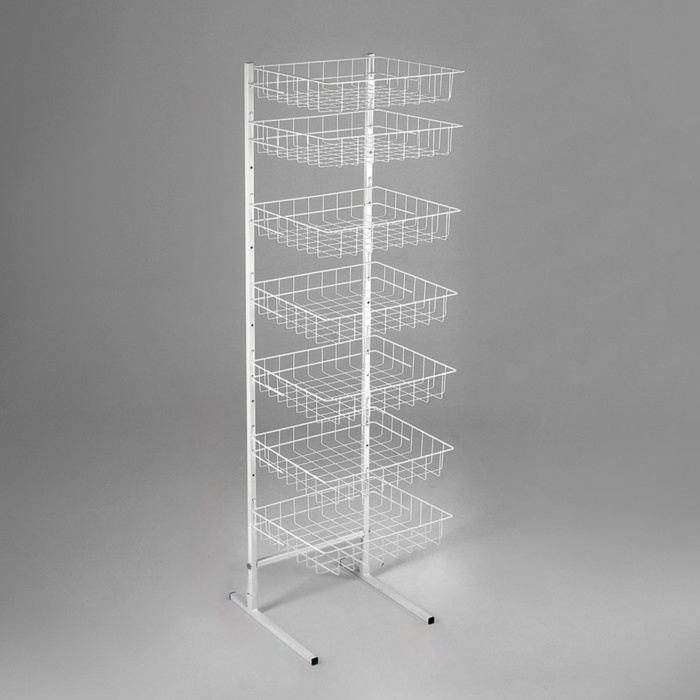 Стойка выполнена в белом цвете, что придает ей аккуратный и современный вид. Белый цвет идеально вписывается в любой интерьер, подчеркивая чистоту и минимализм. Он также помогает выделить продукцию, привлекая внимание покупателей к товарам, размещенным в корзинах.