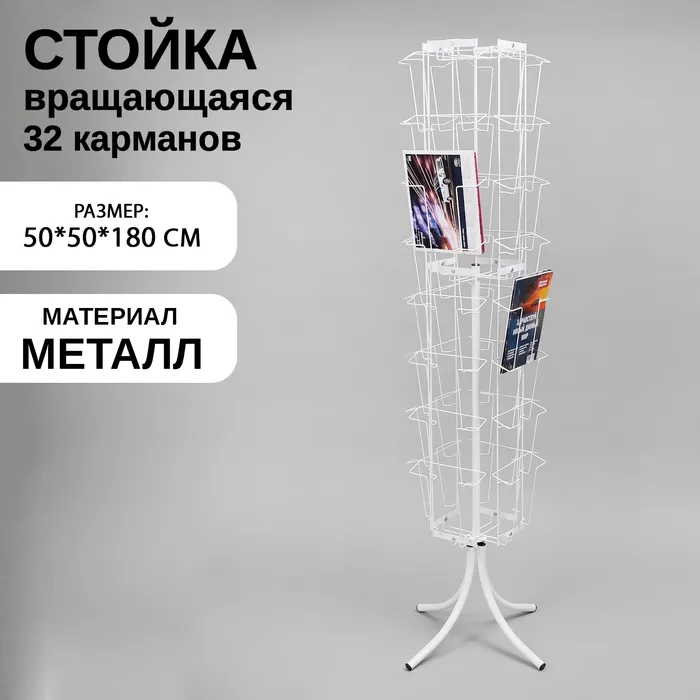Стойка вращающаяся для прайсов — это удобное и функциональное решение для организации и демонстрации прайс-листов, ценников или рекламных материалов в магазинах и офисах. С размерами 50×50×180 см, она оснащена 32 карманами формата A4, что позволяет разместить множество документов или рекламных материалов в одном месте.