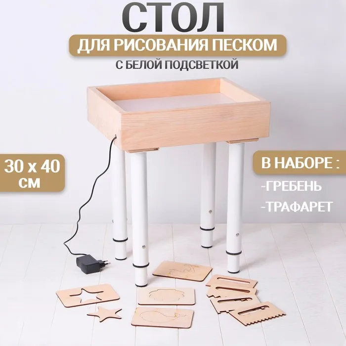 Стол для рисования песком с белой подсветкой, 30×40 см, гребень и трафарет — Характеристики