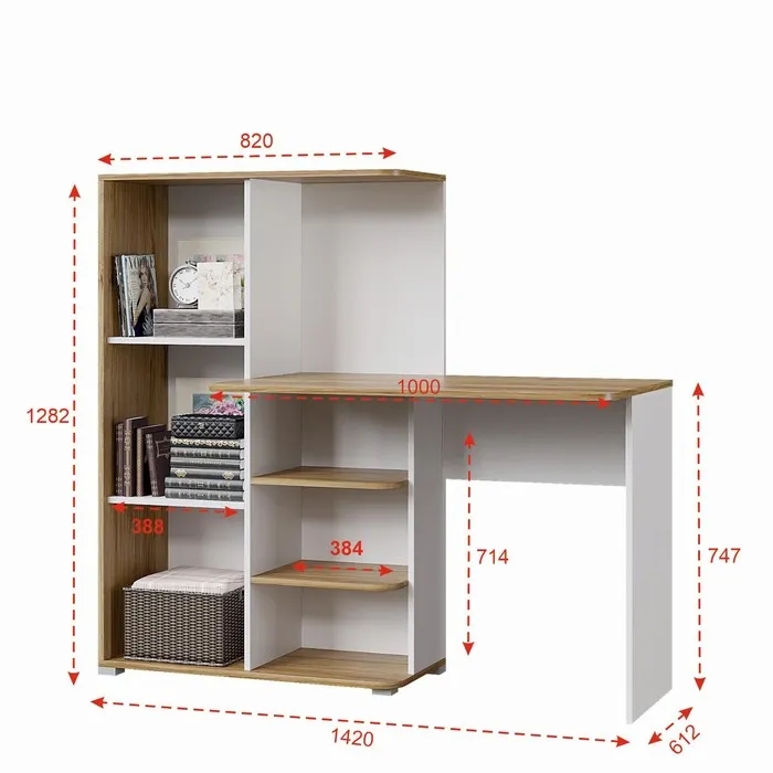 - Полки для хранения: Стол оснащён полками размером 384x320 мм, которые предоставляют дополнительное место для хранения книг, документов и аксессуаров.