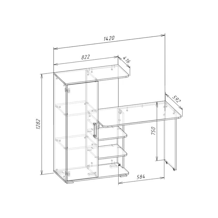 - Функциональность и удобство: наличие полок и шкафа позволяет рационально организовать рабочее пространство.