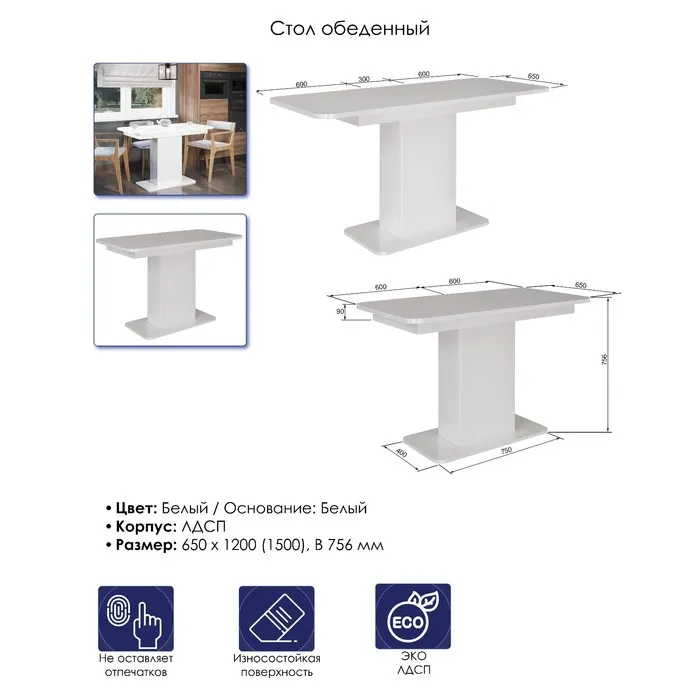 Стол кухонный на одной ножке раскладной СО-3, 1200(1500)х650х756, Белый/Белый — Характеристики