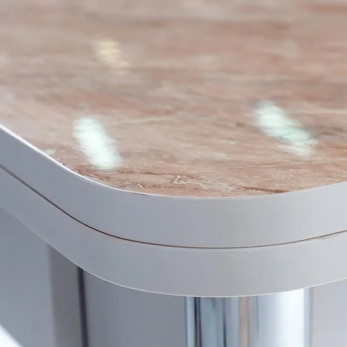 - Цвет (хром и змеевик бежевый): Современное сочетание цветов подчеркивает стильный дизайн стола, добавляя элегантности и современности в интерьер.