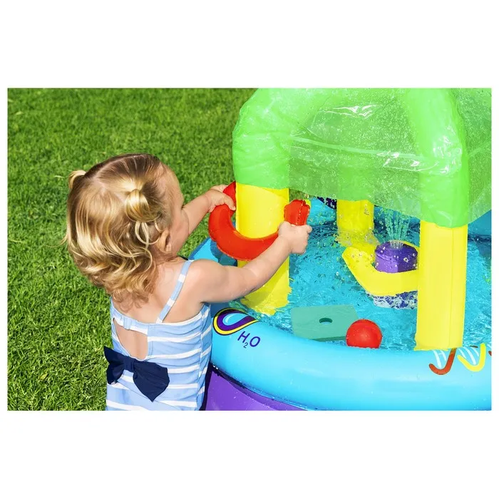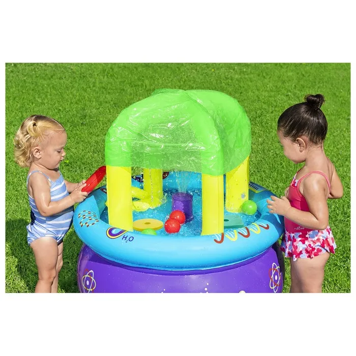 Надувной стол в виде лаборатории можно использовать дома без воды и на улице с подключением к садовому шлангу. С ранних лет малыш будет сам ставить эксперименты: проверять, какие игрушки остаются на поверхности, какие уходят под воду.