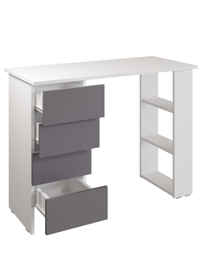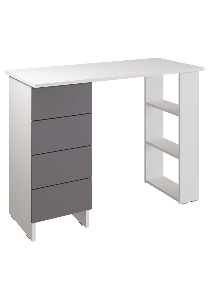 Предмет мебели представляет собой решение для создания функциональной рабочей зоны: письменный стол, дополненный открытыми полками и четырьмя вместительными ящиками для системного хранения. Изготовлен из практичного ЛДСП в актуальных цветовых решениях.